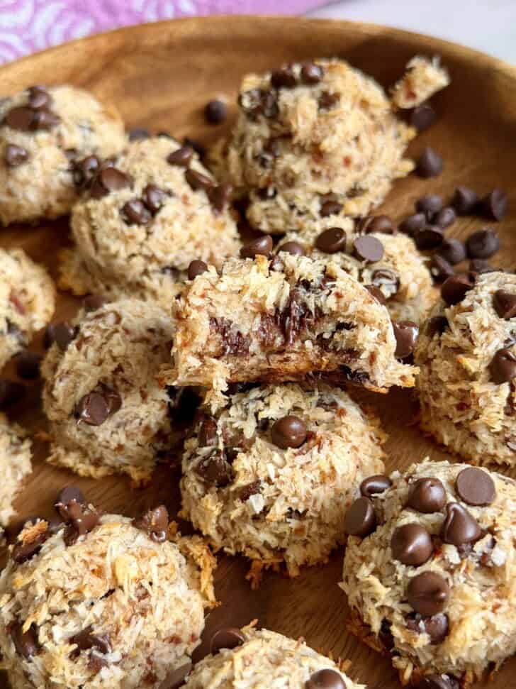 - Soak the dates in the warm milk for 15 minutes. Next, pulse together the dates and milk in a mini food processor until mostly smooth. In a medium mixing bowl, transfer the date paste, coconut shreds, baking powder, salt, chocolate chips and mix until incorporated. Using 1-1½ tbs scooper, transfer the balls to the baking sheet (you can also flatten them out to a disc/cookie shape but I prefer them as balls). Bake for 8-10 minutes or until slightly golden on the edges.