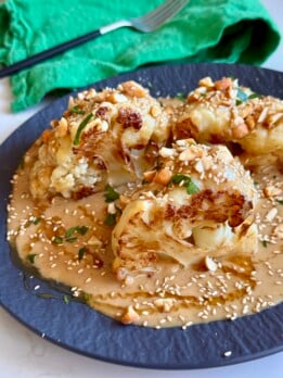 Pan Seared Cauliflower Wedges with Peanut Tahini Sauce