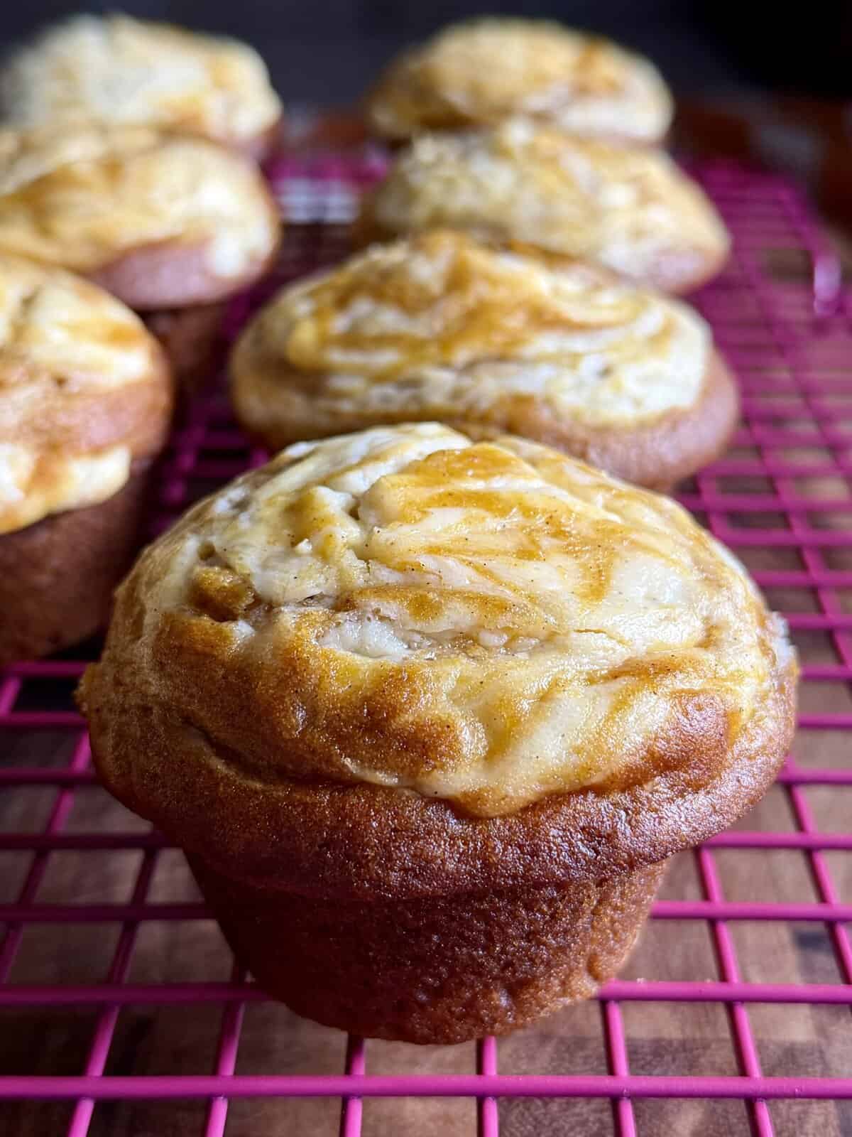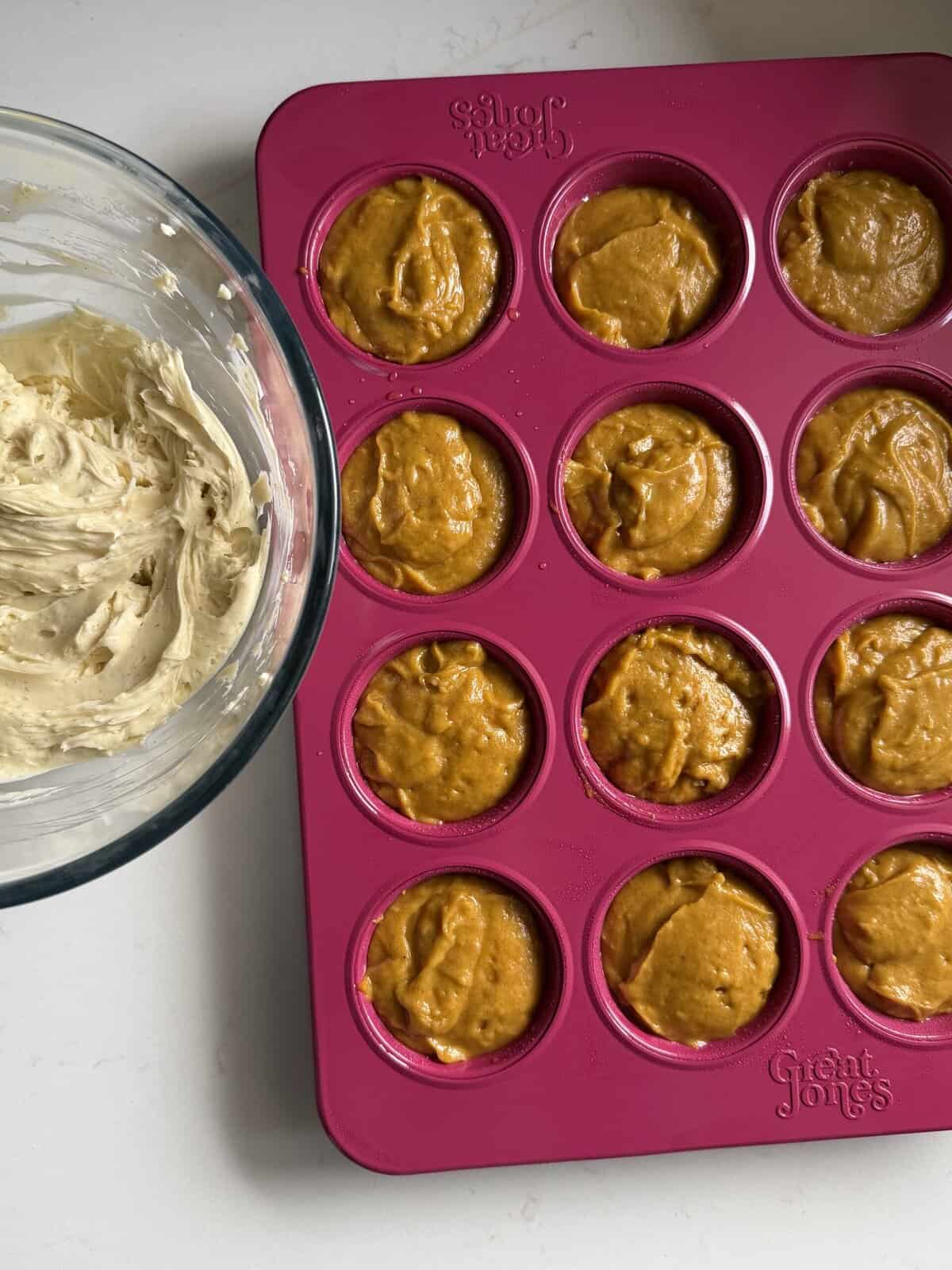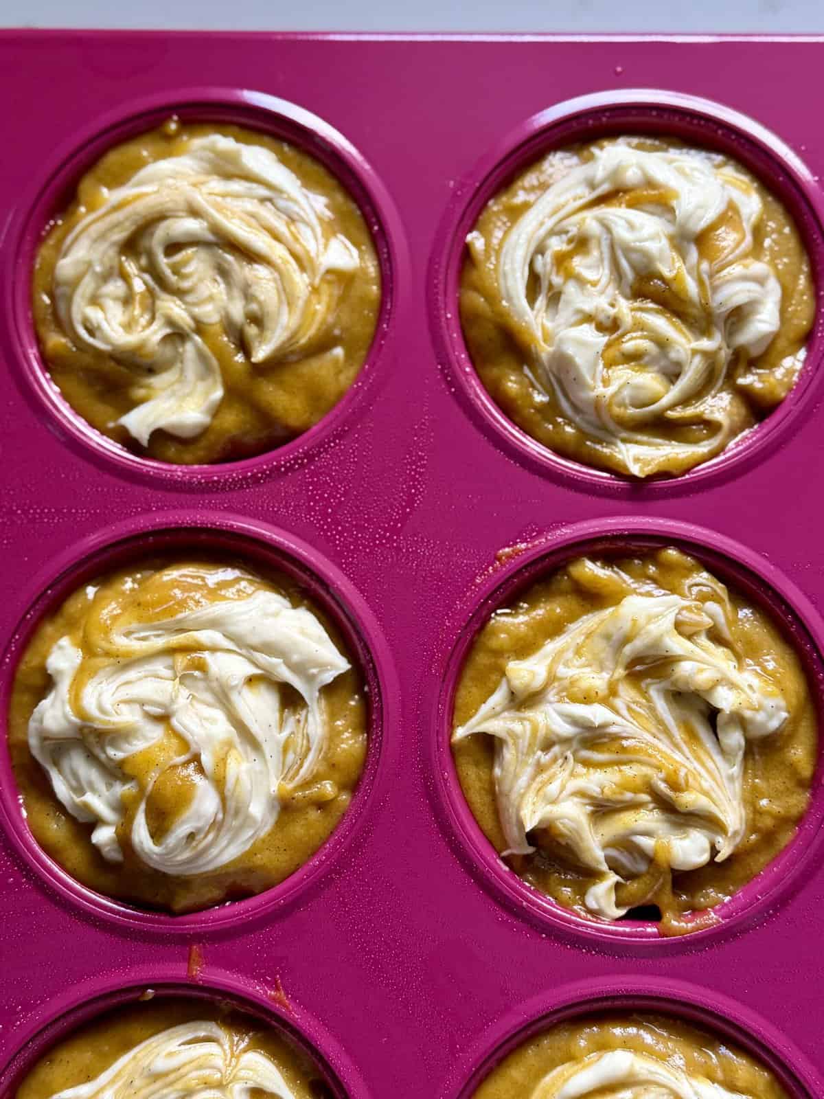 The signature element of these pumpkin muffins is the luscious cream cheese swirl. Typically made by blending softened cream cheese with sugar, vanilla extract, and an egg yolk for extra richness. The mixture is then dolloped onto the pumpkin batter before baking. You can swirled it in with a toothpick or just leave it and press it down slightly.