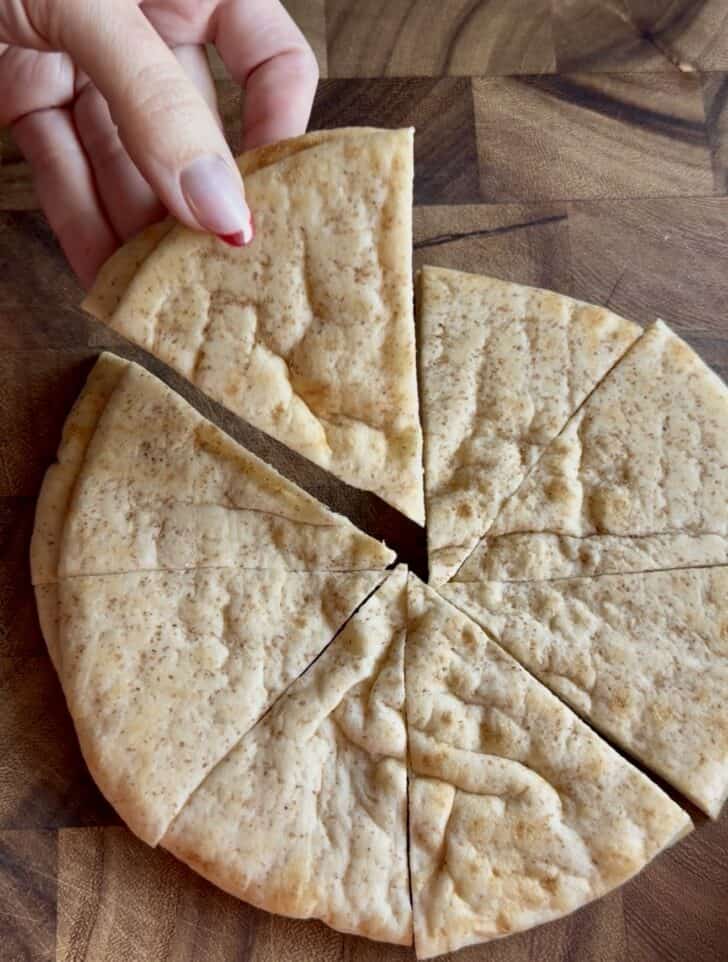 - Slice pita breads in half, then slice them the other way in half so you have 4 pieces and then slice it again in the other direction. You want to end up with 8 triangles. Transfer pita triangles to the baking sheet. Brush both sides with olive oil and sprinkle with flakey salt. Bake for 5-8 minutes or until light brown and crispy.